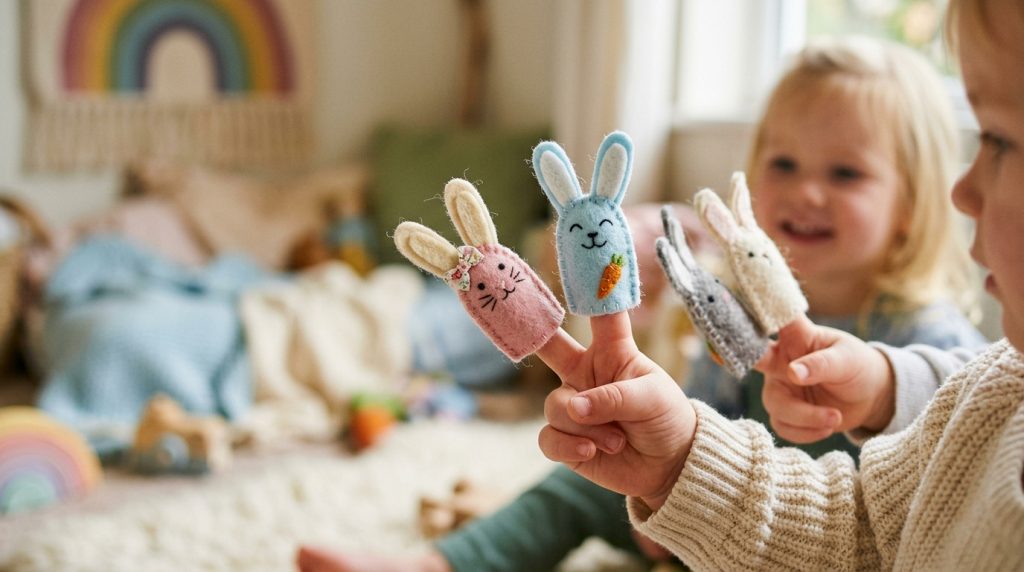 Cut bunny shapes from felt and glue or stitch the sides together, leaving space at the bottom for little fingers. Add tiny felt details like ears, noses, and bow ties.