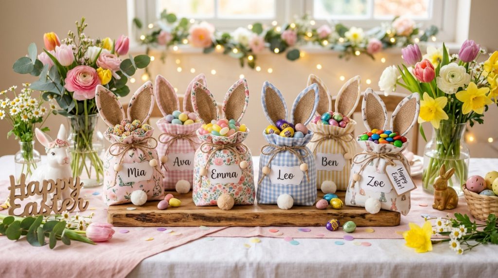 Use small paper bags and decorate them to look like bunny faces. Glue on paper ears, draw eyes and whiskers, and attach a fluffy cotton tail to the back.