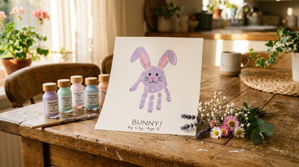 Dip your child’s hand in white washable paint and press it onto paper. Once dry, transform the handprint into a bunny by turning the fingers into ears and drawing on a sweet bunny face.