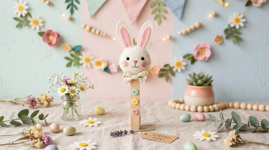 Glue three popsicle sticks side by side to create the base. Cut out a bunny face shape and decorate it with markers, googly eyes, and soft felt ears. Attach the face to the sticks and let kids create their own Easter puppet show.