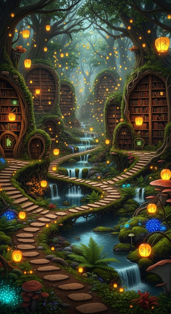 Place your library in the heart of a magical forest. Use natural wood, mossy stone, and vines to blend with the environment. Tree roots and winding paths can guide players through hidden reading nooks. Firefly-like particles with glowstone or lanterns can illuminate pathways. Incorporate a waterfall, a small pond, or floating platforms for fantasy-inspired charm. This library feels alive and full of secrets waiting to be discovered.