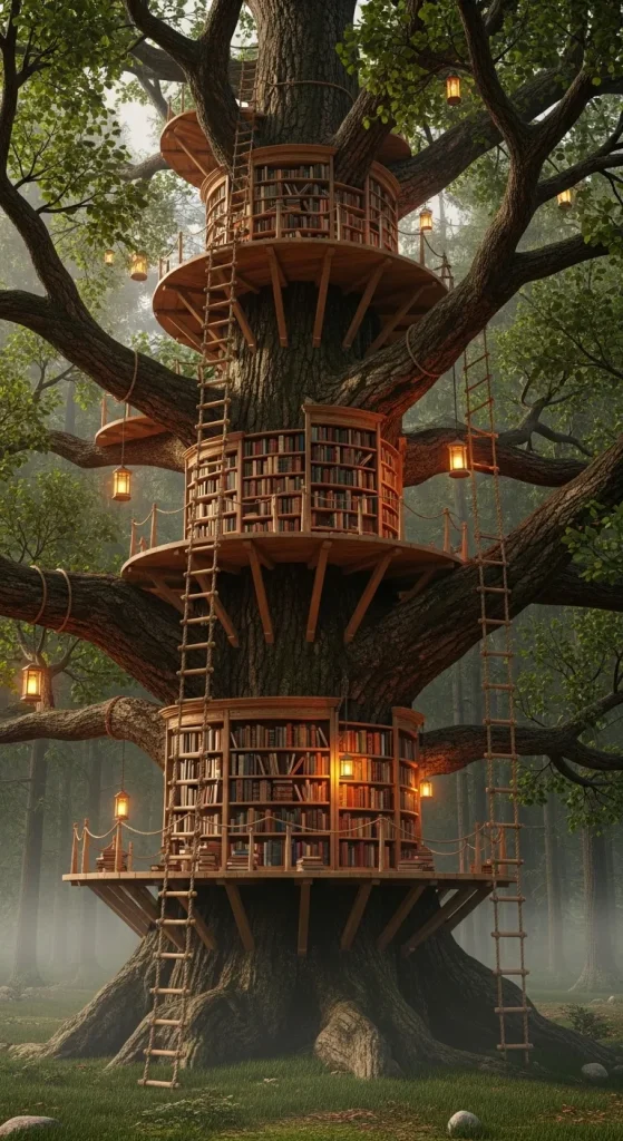 Combine nature and knowledge with a treehouse library. Build a giant oak or jungle tree and integrate bookshelves into its branches. Wooden platforms, rope ladders, and hanging lanterns add charm and accessibility. Add small nooks with seating and reading areas surrounded by leaves, vines, and flowers for a cozy, magical retreat high above the ground.