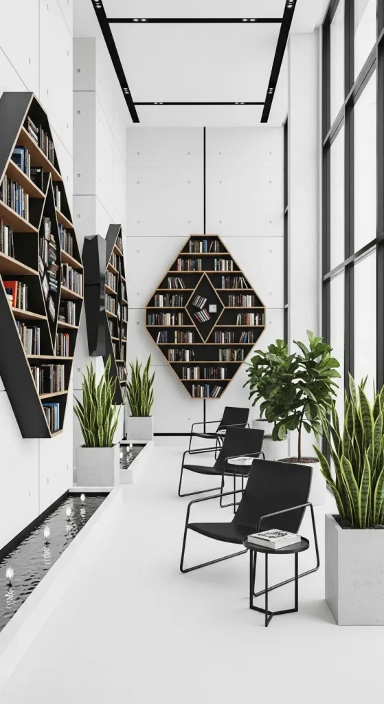 Less is more in a modern minimalist library. Use white concrete, black accents, and glass for sleek lines. Keep bookshelves simple and arranged neatly along the walls or in geometric patterns. Add modern seating areas with leather chairs, potted plants, and water features for a calm reading environment. This library is perfect for players who appreciate elegance, clean aesthetics, and contemporary design.
