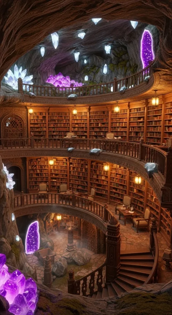 For a mysterious and cozy feel, carve your library into a deep cave. Natural stone walls combined with warm wooden shelves create a contrasting texture. Glowstone, sea lanterns, or hidden torches can illuminate the dark corners. Add crystal-like features using amethyst blocks for a magical touch, and make winding stone staircases that lead to different book chambers, giving it a sense of exploration.