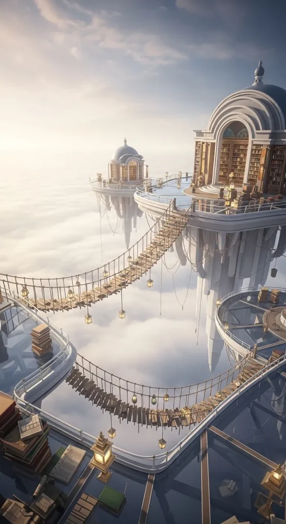 Imagine a library suspended among clouds. Build floating platforms with glass floors and wooden railings. Connect the platforms with elegant rope bridges or glass walkways. Add floating lanterns for ambient lighting and small gardens for peaceful reading areas. This library is perfect for creating a dreamy, ethereal atmosphere, where players can study while gazing at endless skies.
