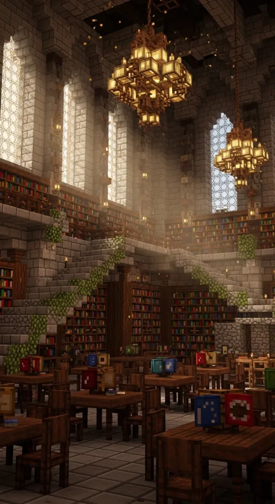 Bring the grandeur of a medieval castle into your library design. Tall arched windows let sunlight pour over wooden bookshelves stacked high. Add chandeliers made of glowstone or lanterns, and stone staircases that wind upward to secret reading balconies. The stone and wood combination gives a timeless, majestic feel. You can also include an enchanted books section in a hidden alcove for that extra mystical touch.