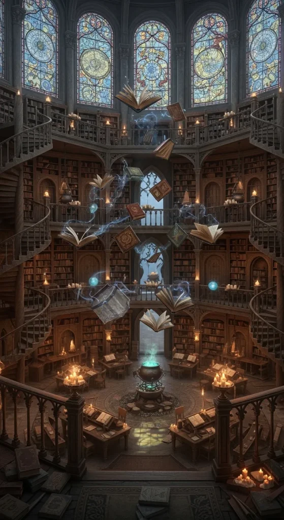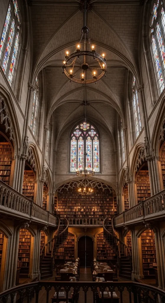 For dramatic impact, design a Gothic cathedral-style library. Tall stained glass windows, pointed arches, and vaulted ceilings add grandeur. Use dark wood and stone for bookshelves and floors. Incorporate elevated balconies, spiral staircases, and intricate railings to enhance the majestic atmosphere. Dim lighting from chandeliers and candles will give it a mysterious, awe-inspiring vibe, perfect for epic roleplay or storytelling.