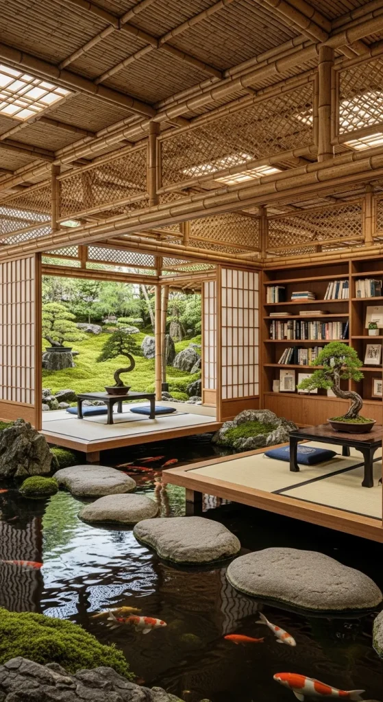 Inspired by traditional Japanese architecture, create a peaceful Zen library. Use bamboo, dark oak, and paper lanterns for natural harmony. Tatami-style reading areas, sliding shoji doors, and koi ponds enhance the tranquility. Arrange low wooden bookshelves in symmetry and add small garden areas inside or outside for meditation corners. The calming ambiance makes it ideal for players who want relaxation and focus.