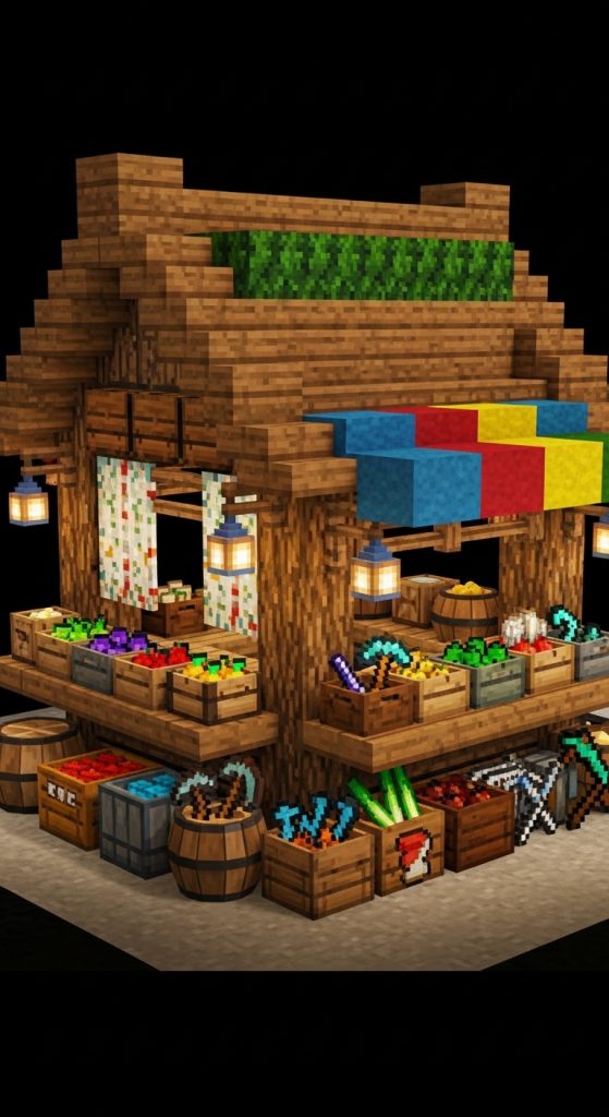 The first idea is timeless—a wooden stall with a simple overhang. Use oak or spruce wood for the structure, with fences as support posts and a roof made of colorful wool or wooden slabs. Add crates, barrels, and a small counter to give it a realistic market feel. For survival, tuck a bed and chest under the stall or behind a curtain for a tiny living space.