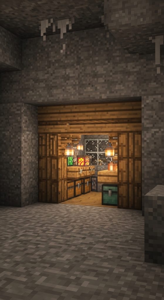 Blend your stall into the landscape by creating an underground version. Build a small entrance with a wooden door, a wool or trapdoor roof, and some lanterns for lighting. Inside, organize chests, crafting tables, and furnaces into compact storage and survival zones.