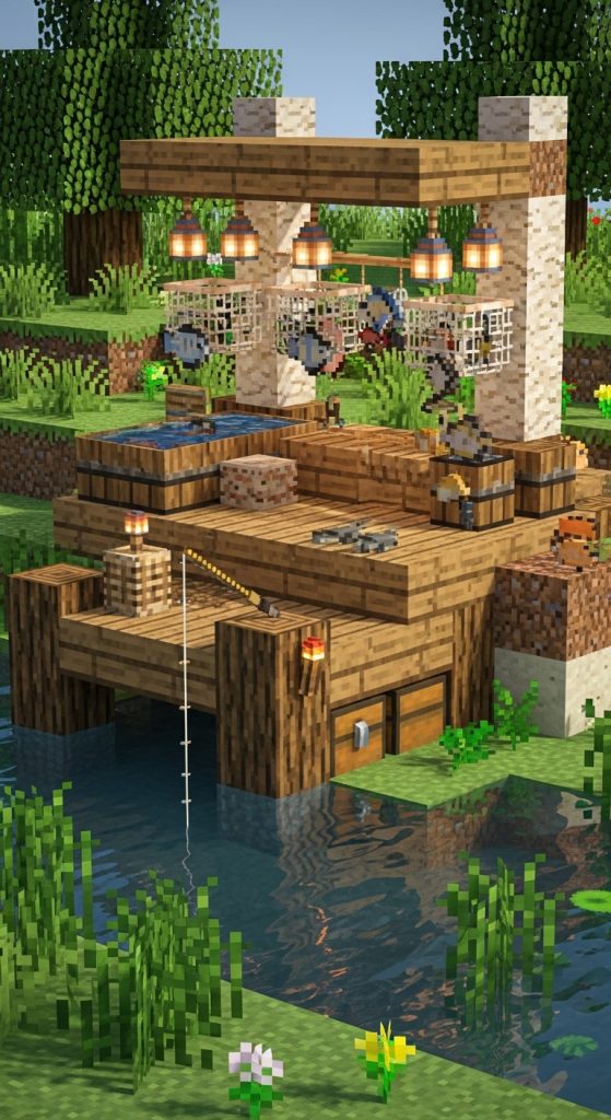Why it works: Floating stalls are unique, visually stunning, and functional in water-based survival builds.
