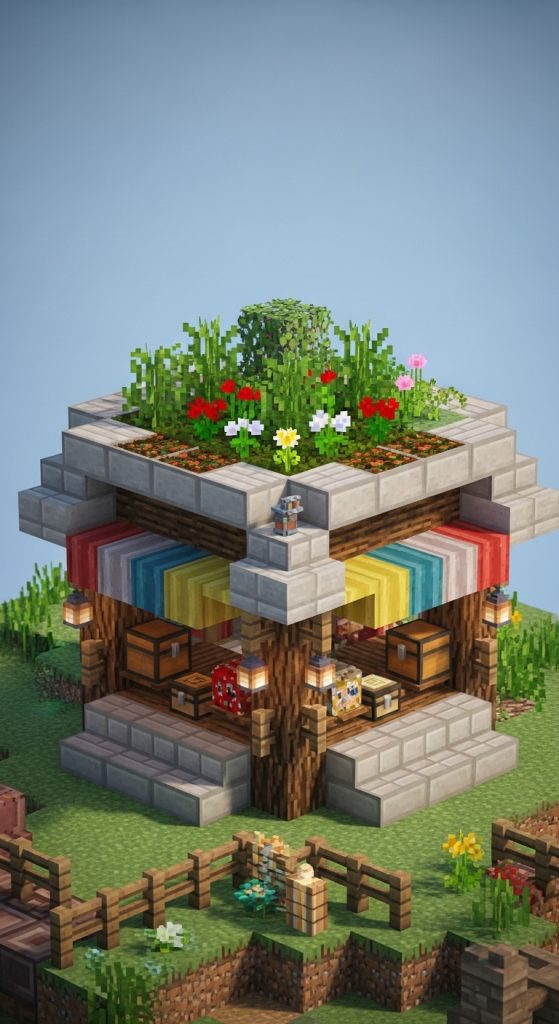 Combine survival practicality with beauty by adding a small garden atop your stall roof. Use slabs and stairs for the roof, plant flowers, crops, or even small trees on top. Inside, store essentials like food, tools, and trading items. Lanterns and fence accents will keep it charming and cozy.