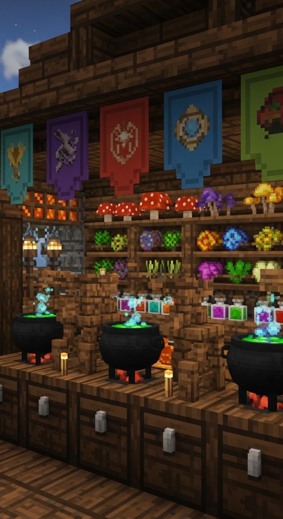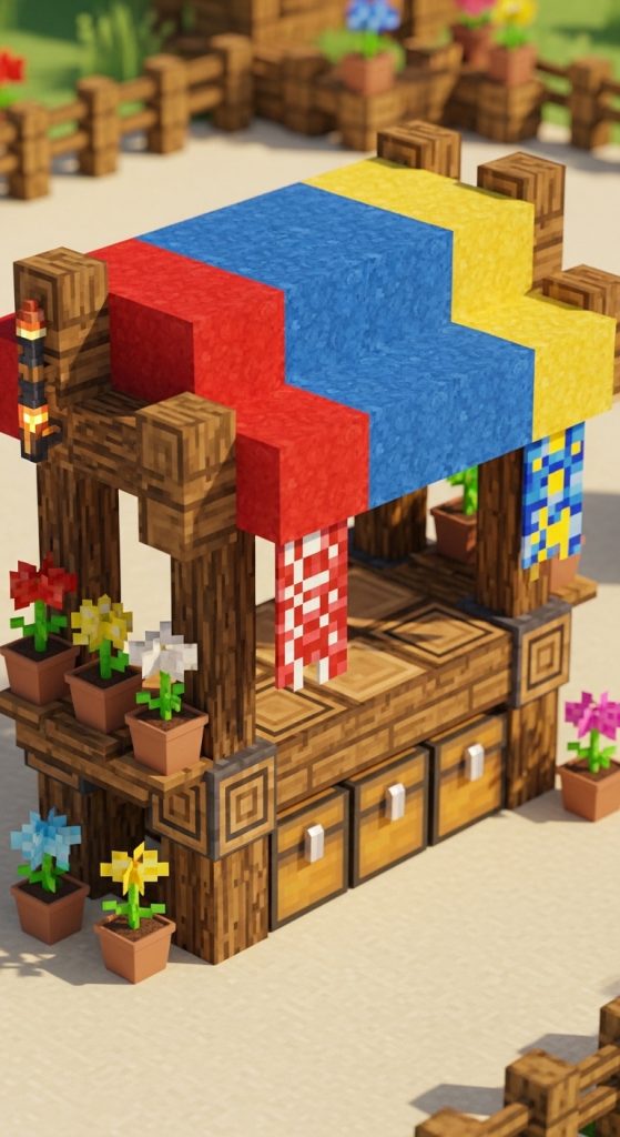 Design your stall as an alchemy or potion shop. Use dark oak or spruce wood with colorful banners and hanging lanterns. Place cauldrons, brewing stands, and shelves for potion ingredients. For survival practicality, hide chests under counters for ingredients and tools.