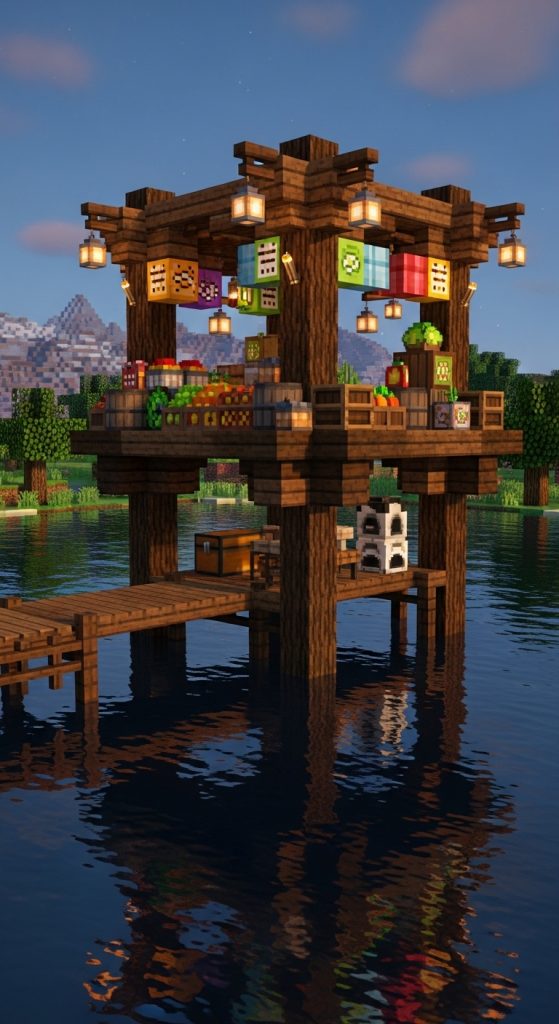 Take your market stalls to the water! Build your stall on stilts above a lake or pond using spruce or dark oak logs. Connect it with wooden walkways and ladders. Add barrels, crates, and lanterns for decoration. Survival players can store fishing gear, boats, and resources underneath the structure.
