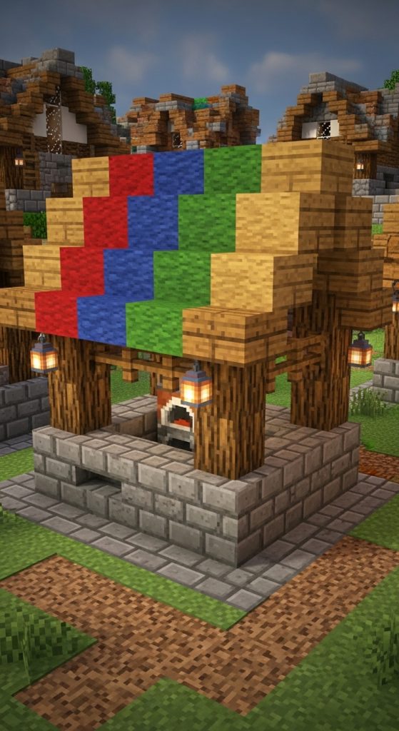 Bright wool blocks can instantly make a stall eye-catching. Combine red, blue, yellow, or green wool with wooden slabs for the roof, using fences to frame the structure. Inside, create compartments for storing survival resources like food, tools, and trading items.