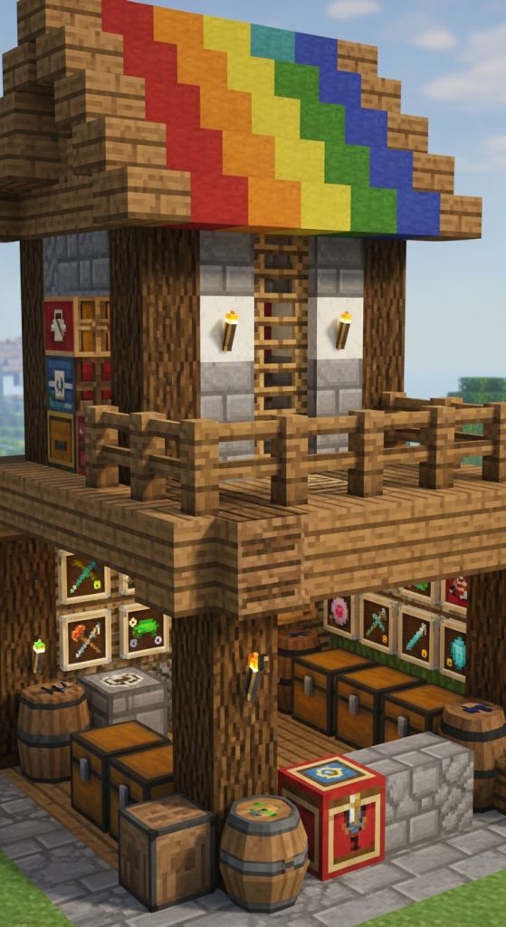 For more advanced builders, create a multi-level stall where the upper floor acts as a small living space. Use ladders or staircases to access the loft, store survival items below, and add a balcony with fences. The roof can be made from slabs or colorful wool to give a stylish look.