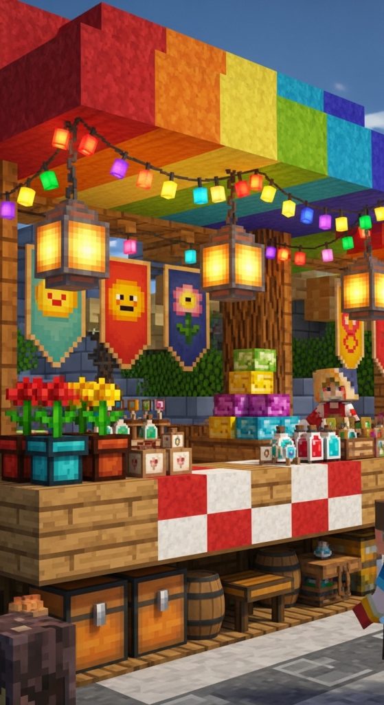 Make your stall festive by using bright wool, wooden supports, and hanging lanterns or glow berries. Add small decorative touches like banners, flower pots, or item frames. Survival-friendly storage can be tucked neatly under the counter, keeping the area organized.