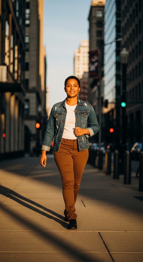 A denim jacket instantly makes brown pants look playful and relaxed. Choose slim or straight-leg brown pants and pair them with a fitted top underneath. Layer a classic blue denim jacket on top for that effortless street-style appeal.