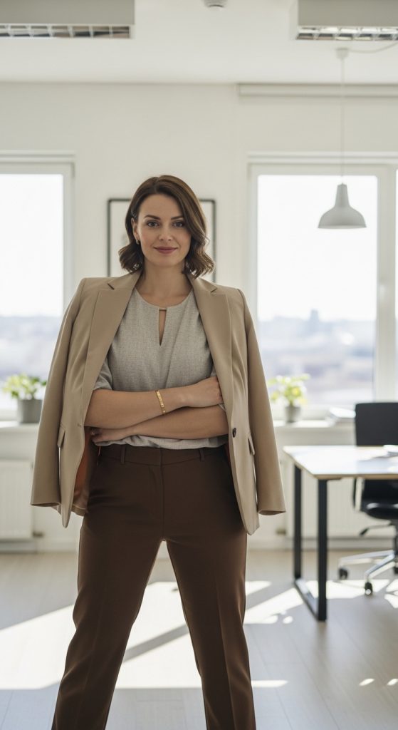 If you want to elevate your casual look, add a tailored blazer. A beige, cream, or even soft pastel blazer pairs beautifully with brown pants. Underneath, keep it simple with a neutral top.
