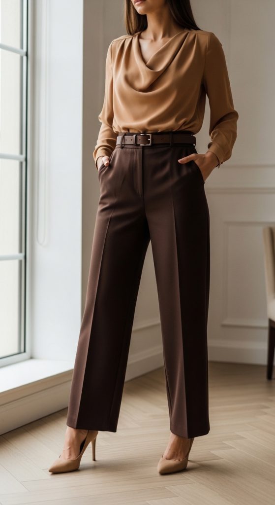 For a touch of elegance in a casual setting, try pairing brown pants with a satin or silk blouse. Soft champagne, ivory, or muted gold shades enhance the warmth of brown beautifully.