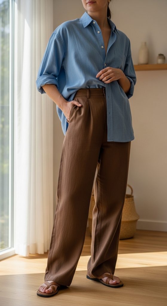 An oversized button-down shirt paired with brown pants creates a relaxed, modern silhouette. Choose white, sky blue, or soft pastel shirts and leave a few buttons open for a laid-back feel.