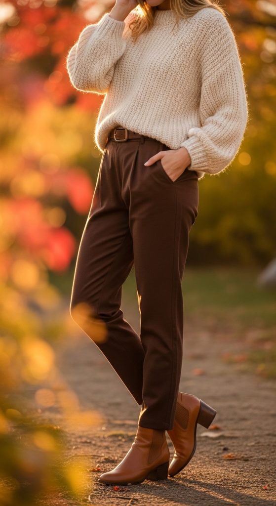 For cooler days, pair your brown pants with a chunky knit sweater in beige, cream, or soft blush. The texture of the knit adds depth and coziness, while brown keeps the outfit grounded and elegant.