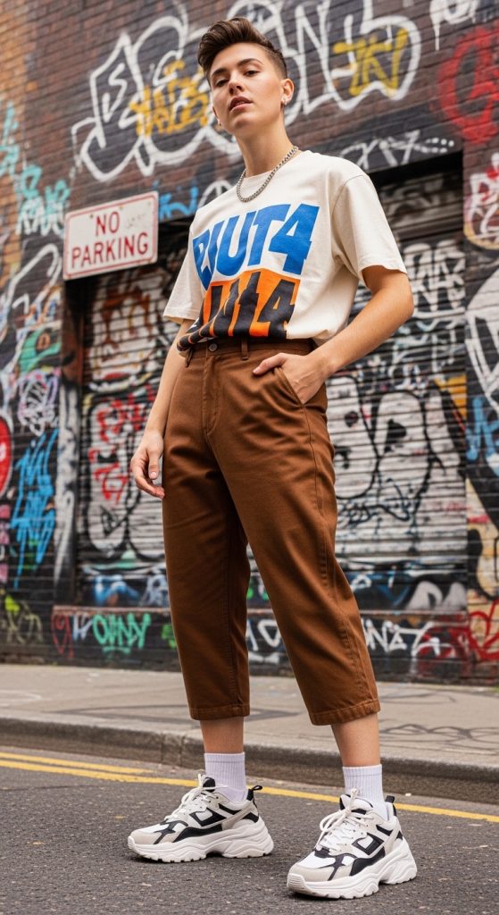 For a youthful and trendy style, pair brown pants with a graphic tee. This combination feels playful yet grounded. Choose relaxed-fit brown trousers or cropped pants and tuck in the tee loosely.