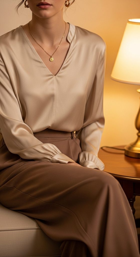 This outfit is perfect for casual evening gatherings or date nights. Add delicate heels and minimal jewelry to keep the focus on the fabric’s soft shine and the richness of the brown pants.