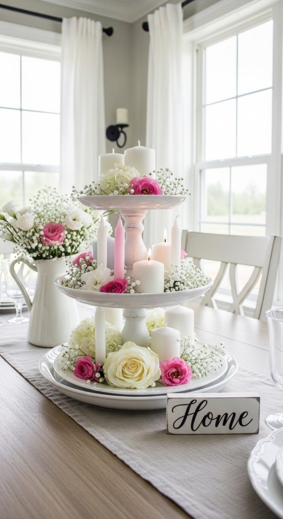 Decorate the tiers with mini flower arrangements, candles, or seasonal décor items. This centerpiece adds height and dimension to your table while remaining affordable and customizable for any occasion.