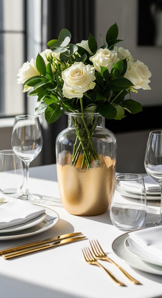 Add white roses, blush peonies, or soft greenery. The contrast between clear glass and shimmering gold makes the design look high-end and modern. This idea works beautifully for bridal showers and formal dinner parties.