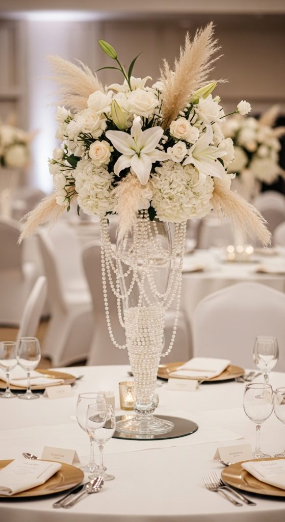 The pearl detail gives a timeless, classy feel. This centerpiece looks especially stunning at weddings, engagement parties, or anniversary dinners.