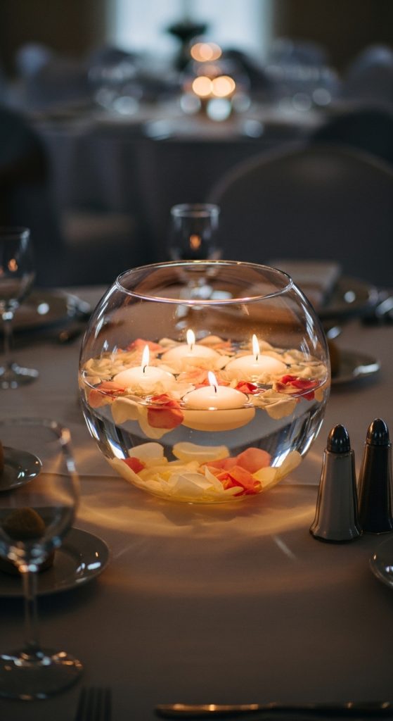 When lit, floating candles create a dreamy glow that reflects beautifully on surrounding surfaces. This centerpiece feels serene, elegant, and perfect for evening events.