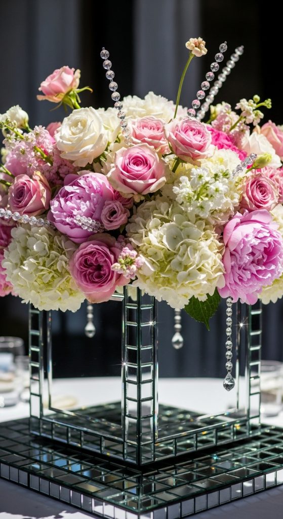 The mirrored sides reflect light and color, making the flowers look fuller and more vibrant. Add crystal beads cascading from the arrangement for extra drama. It’s bold, elegant, and unforgettable.