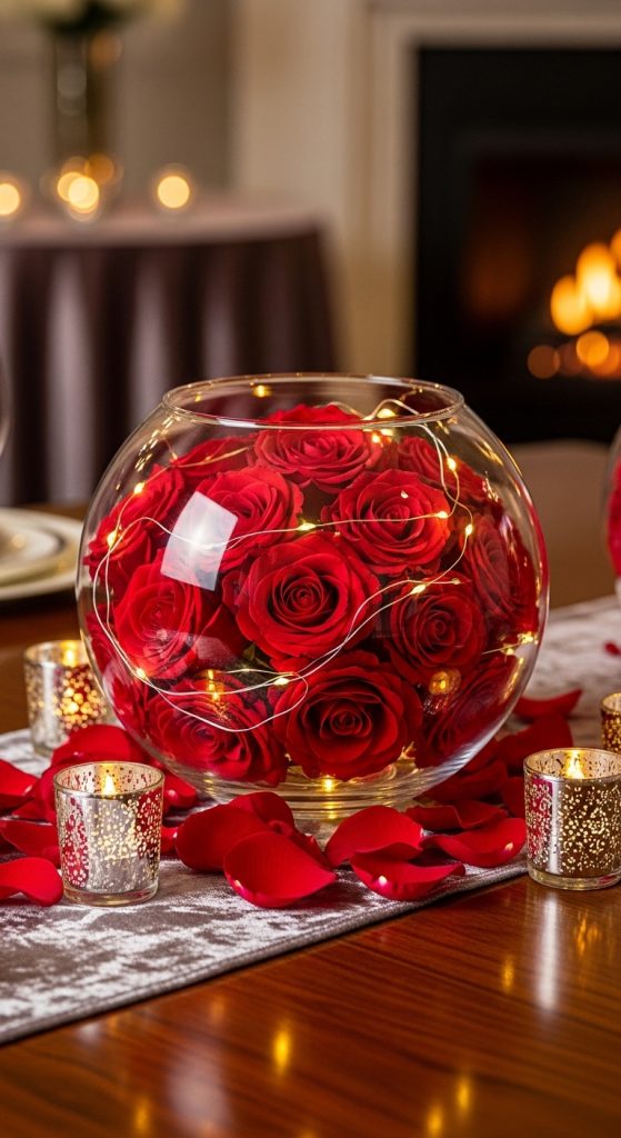 Use a clear glass globe or fishbowl vase and fill it with tightly arranged faux roses. Add fairy lights inside for a magical glow.