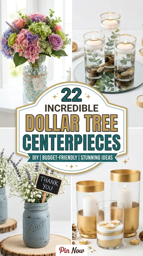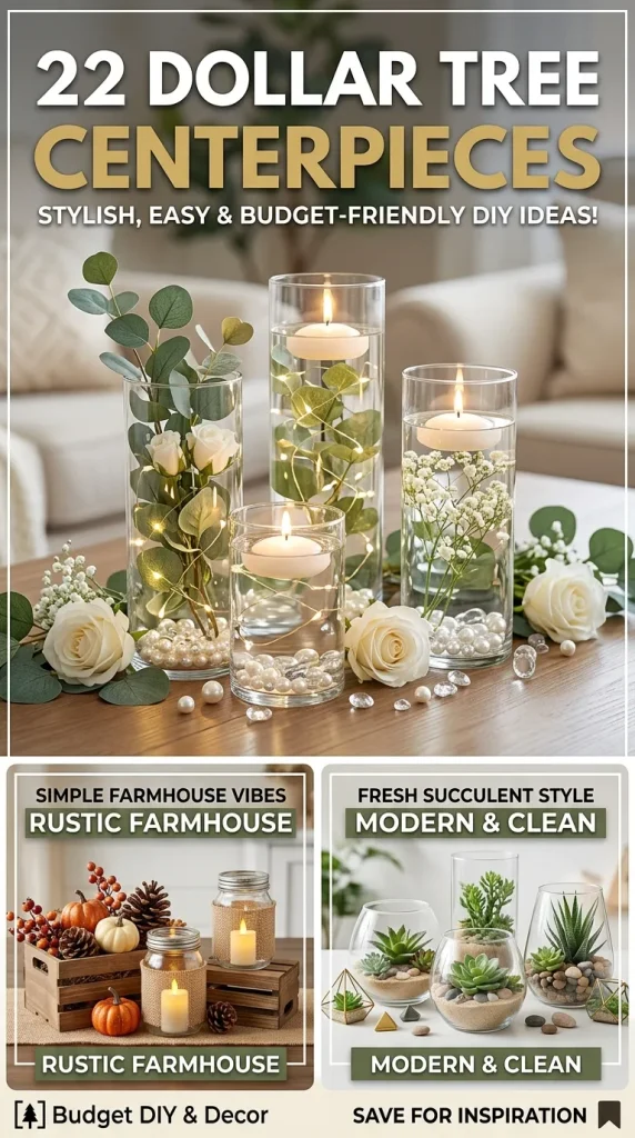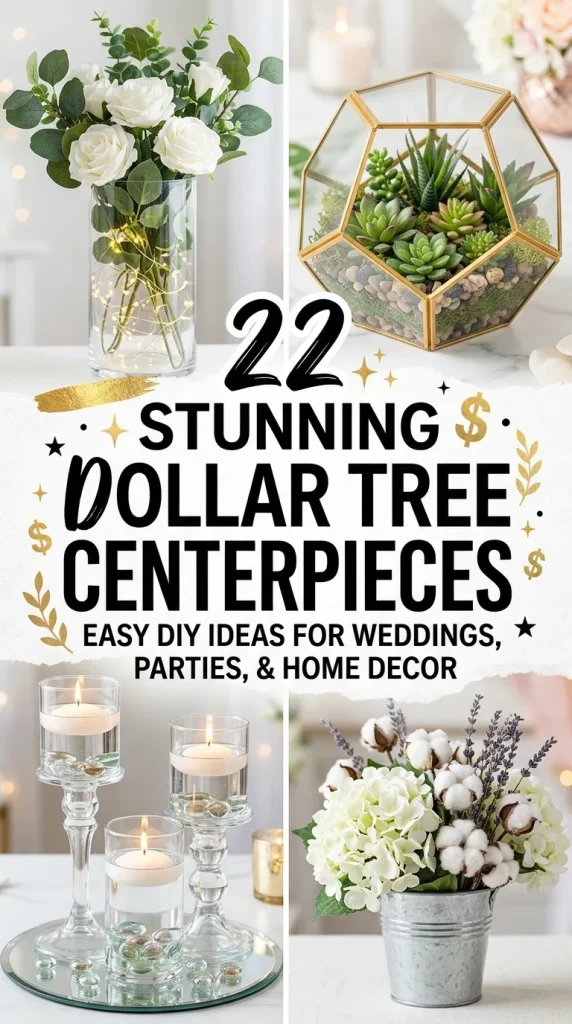 From rustic farmhouse charm to glamorous crystal elegance, these ideas prove that creativity matters more than cost. So grab your glue gun, pick up your favorite Dollar Tree finds, and start designing centerpieces that truly shine.