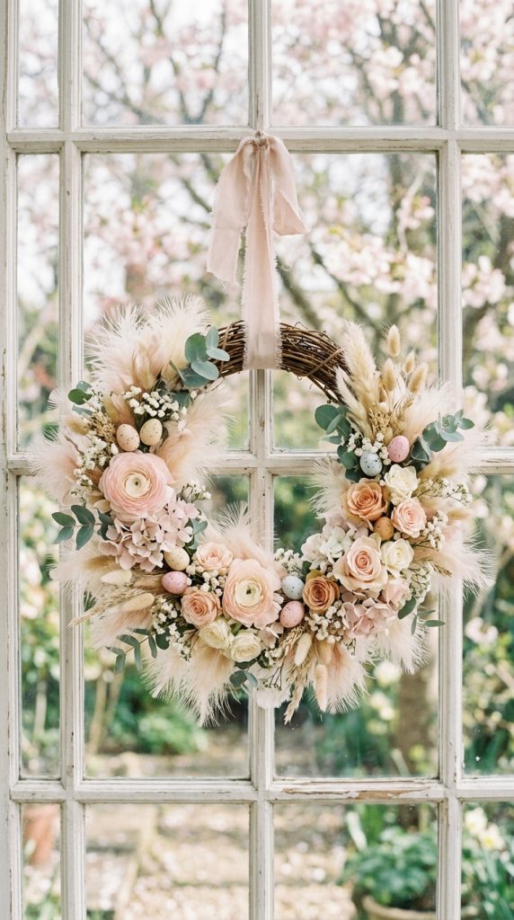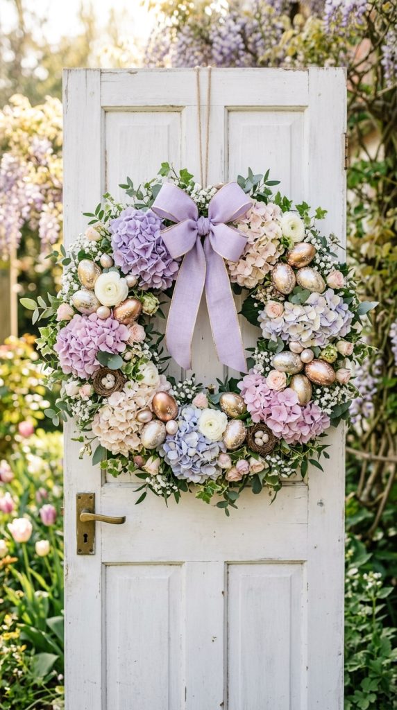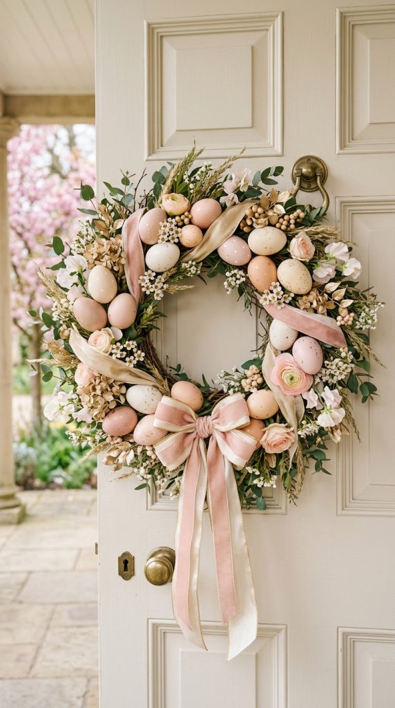 Add small decorative Easter eggs in soft metallic finishes tucked between the blooms. The result? A dreamy, high-end wreath that feels both festive and classy.