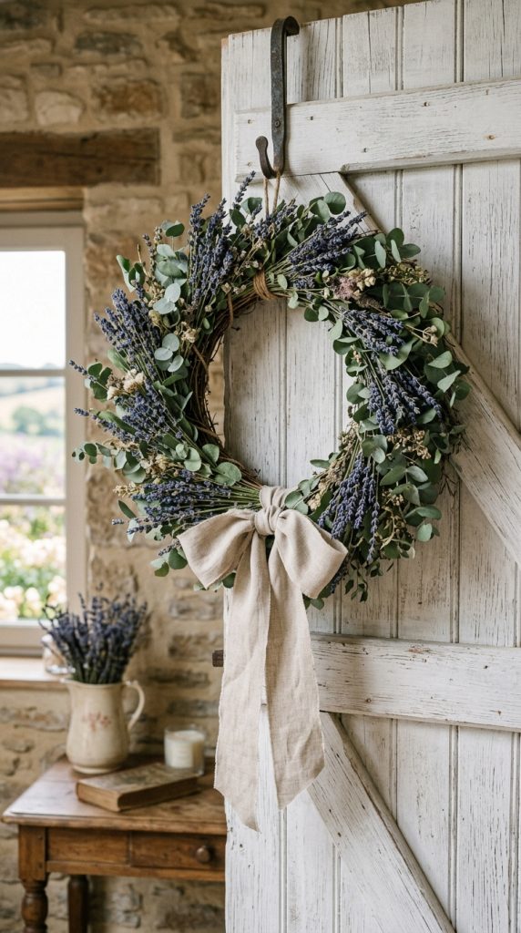 Inspired by French countryside charm, this wreath combines dried lavender bundles with silver-dollar eucalyptus. Use a natural twig base and arrange the greenery asymmetrically for a designer look.