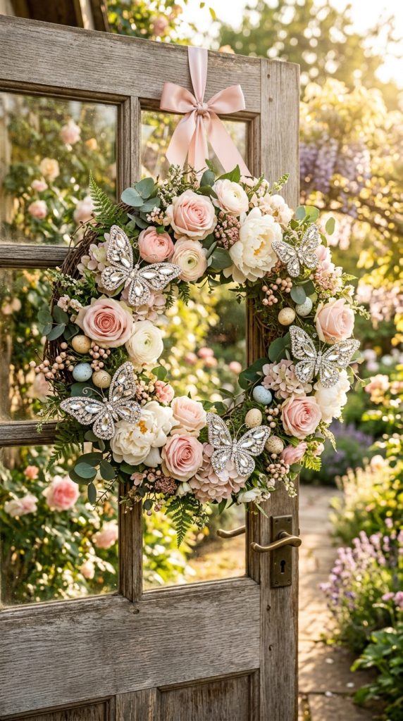 Transform your wreath into a magical spring garden. Use soft pink and cream florals as the base, then add delicate crystal or rhinestone butterflies.