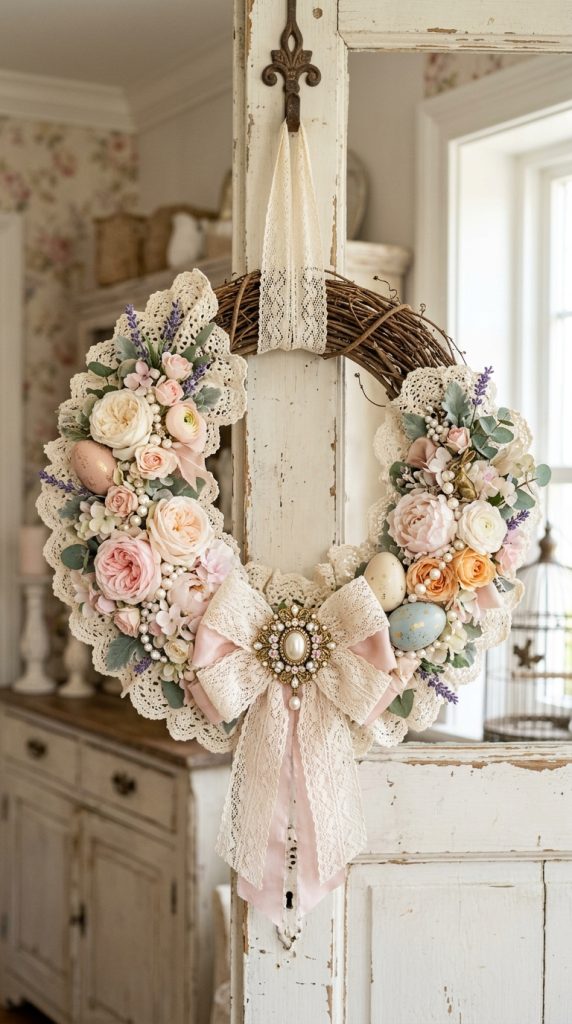 If you adore romantic, vintage aesthetics, this idea is for you. Wrap sections of your wreath base with delicate lace fabric. Add soft pink roses, muted greenery, and tiny faux pearls.