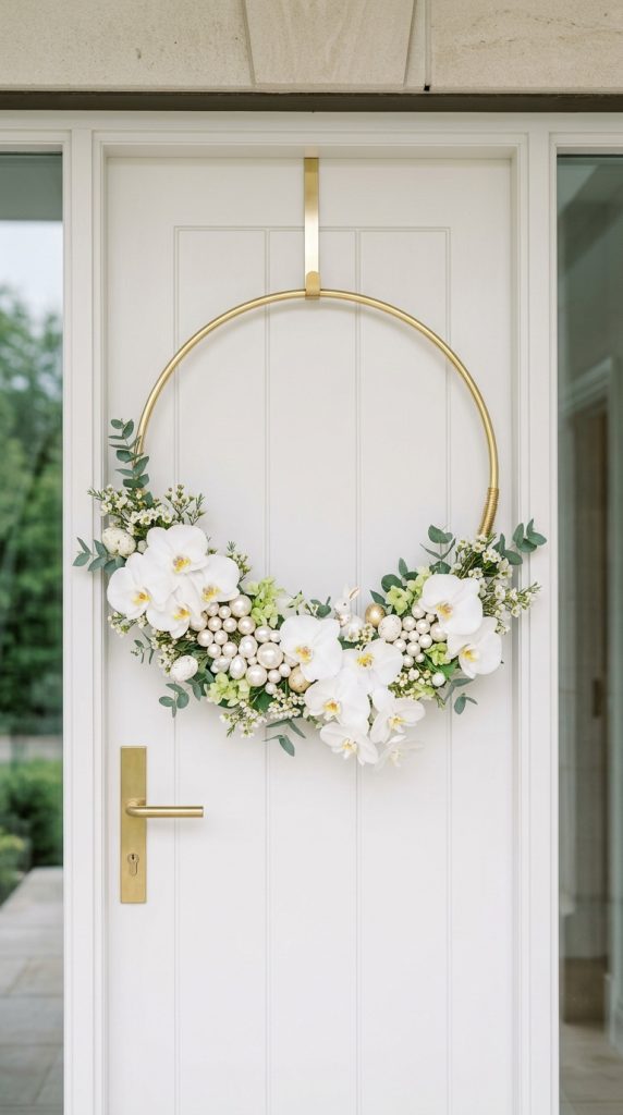 For a modern luxury vibe, nothing beats white orchids. Use high-quality faux orchids arranged in a crescent shape on a white or gold hoop wreath. Add pearl strands draped gently between the blooms for an elegant bridal-inspired aesthetic.